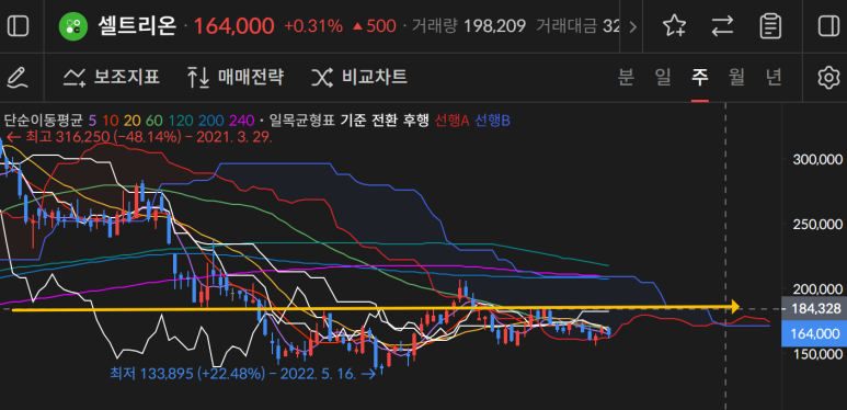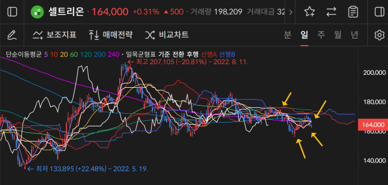 셀트리온도 최근 240일선 위치에서 자리를 유지하고 있는 주식중하나다.