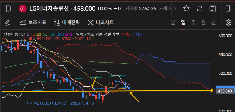 한화솔루션 역시 저항을 보였던 자리에서 계속 하락중이다.