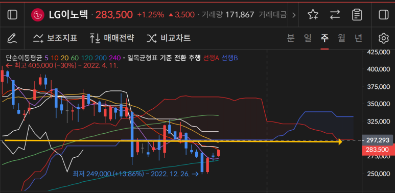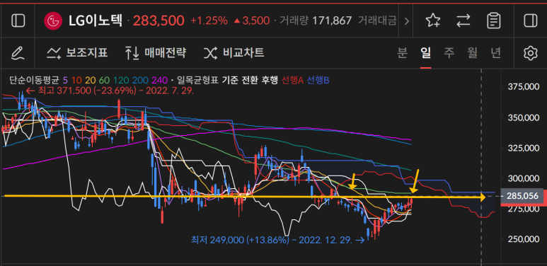 lg이노텍이 285000원을 돌파하면 매수타이밍이 나올 수 있을 것 같다.