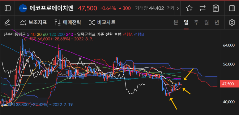 240일선에서 높은 음봉이 나옴으로써 다시 조정중이니 다음 상승이 필요한 상황이 되었다.