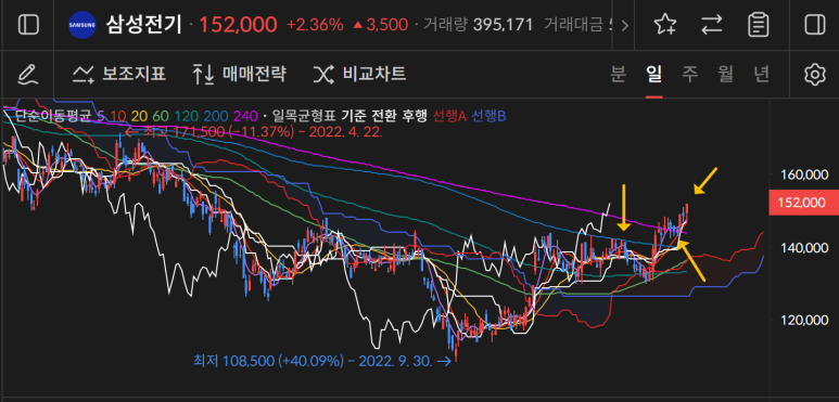 삼성전기가 240일선을 돌파하며 역사적인 순간을 기록했다.