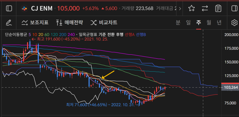 cjenm이 240일 부근에서 U자형태로 큰 상승이 나오면서 105000원을기록했다.