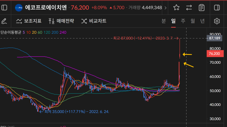 에코프로에이치엔은 오늘 87000까지 상승했으나 76200원까지 크게 조정이 나오면서 상승이 마감되었다.