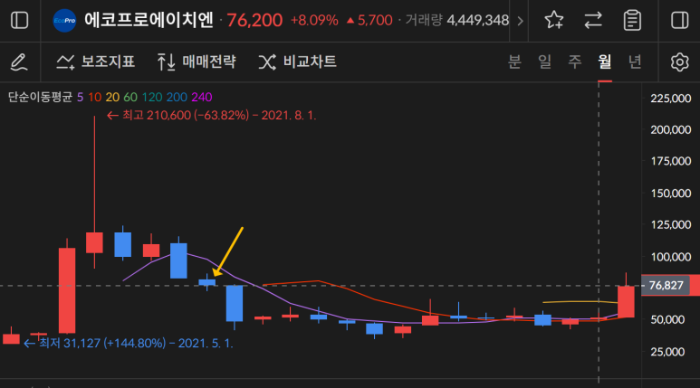 76000원의 자리는 이전에 본격적으로 큰 하락이 나왔던 자리라서 중요하다.