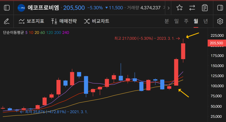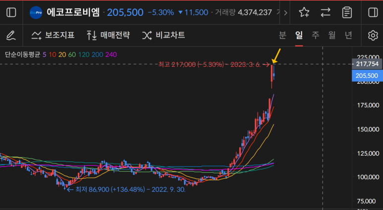 에코프로비엠은 에코프로와는 달리 217000원의 저항을 연속 2일 보여주었고