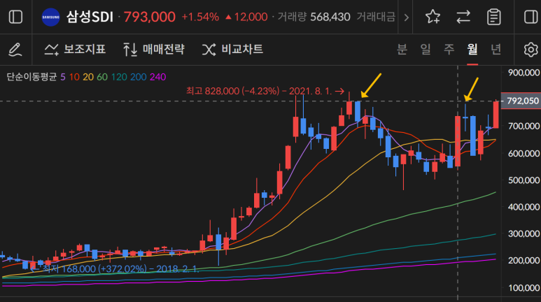 삼스디는 이 번 상승세로 이 전 고점이었더 828000원을 돌파할 수 있는 타이밍이 되었다.