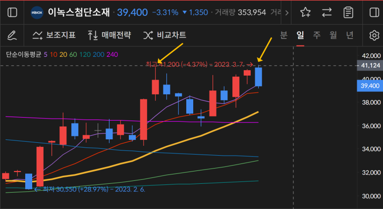 이녹스첨단소재가 41200원에서 저항이 나오면서 큰 하락이 나왔다.