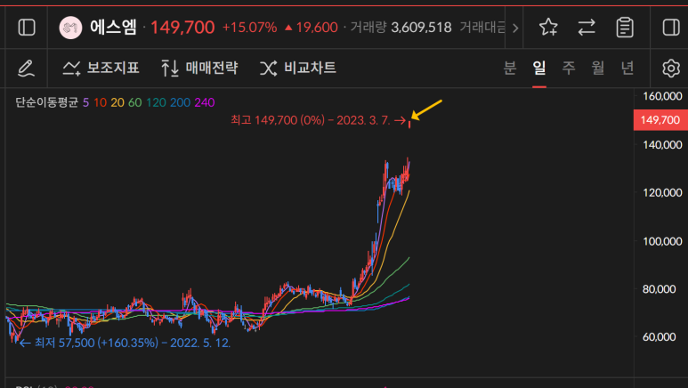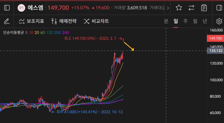 오늘 하루 갭상승으로 149700원까지 오른 에스엠을 볼 수 있었다.