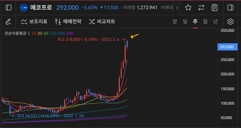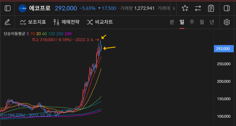 에코프로가 우선은 318000원 이후 조정이 나오고 있는 것으로 보이고