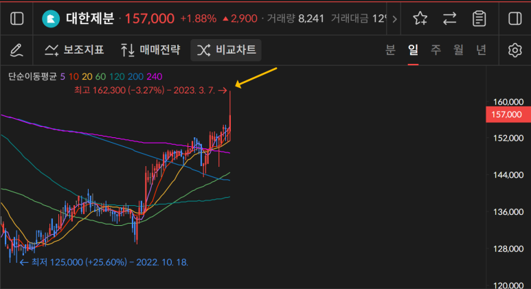 대한제분이 큰상승을 기록하면서 162300원의 윗꼬리를 남겼는데