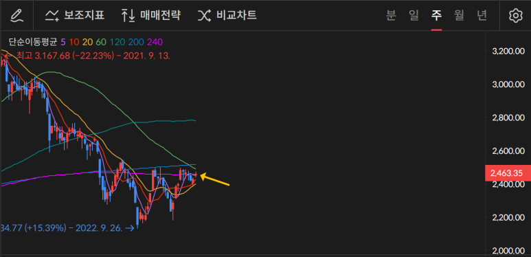 여전히 상승세이며 이 상승세로 인해서 2500을 기대할 수 있게 되었다.