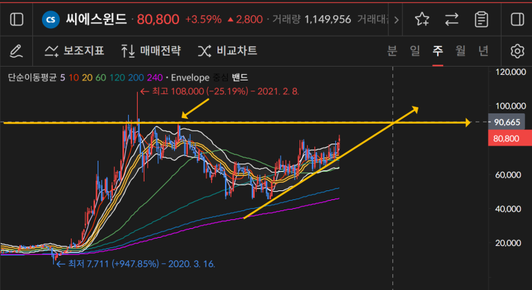 씨에스윈드는 8만원을 달성하면서 추가상승을 기대할 수 있게 되었다.