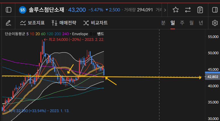 솔루스첨단소재는 5만원대에서 저항이 나왔고 현재는 43200원으로 마감되었다.