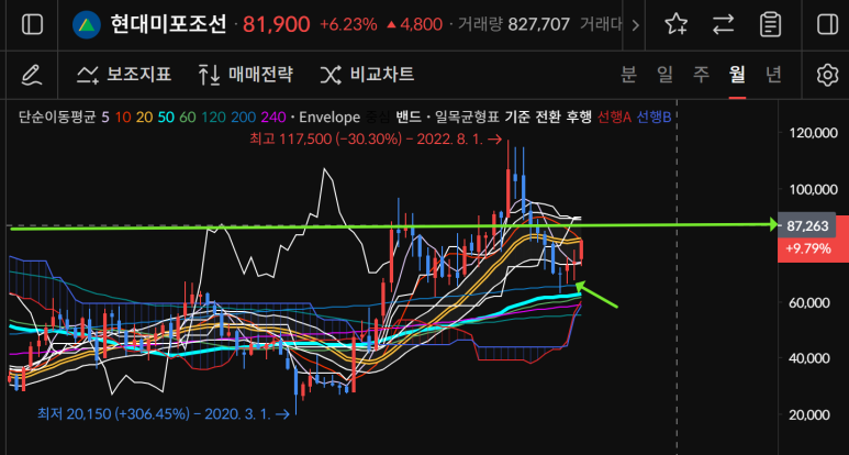 요즘 조선주의 상승세로 현대미포조선도 상승세이며 월차트로 어느새 20일선을 회복했다.