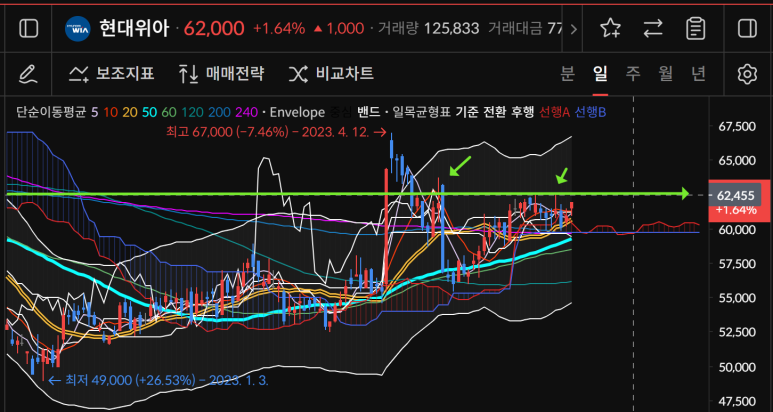 현대위아가 이번주 62450원을 돌파하고 지지한다면 다음 스텝을 기대할 수있기 때문에 중요한타이밍이다.