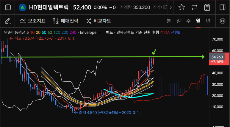 현대일렉트릭은 이번달 추가상승이 나오면 최고가 7만원까지 기대할 수있다.