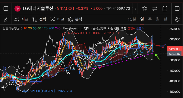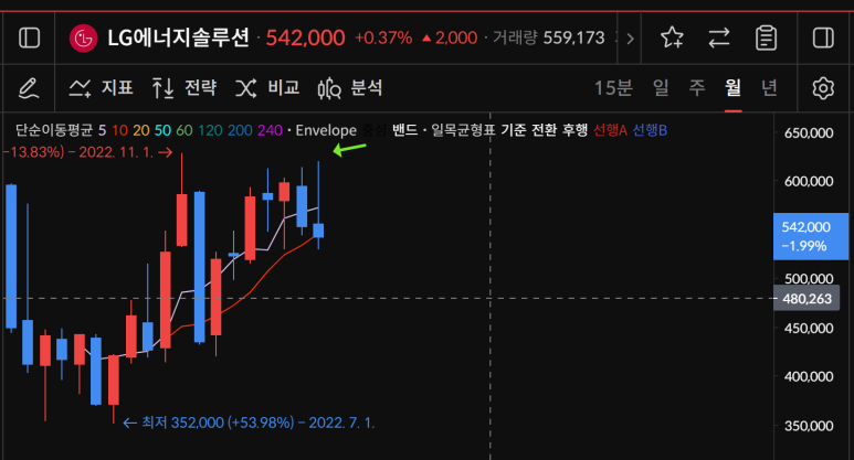 lg엔솔은 실적발표후 좋은 상황으로 보이지 않기떄문에 ㅌ현재 60의 저항과 53의 240일선 지지가 중요한 상황이 되었다.