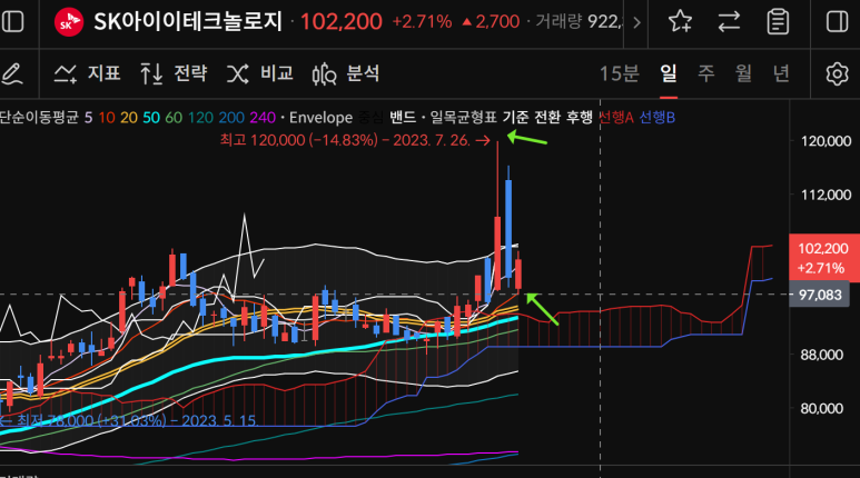 sk아이이테크놀로지는 12만원 이후 긴 음봉이 나왔고 다시 102200원까지 회복하면서 마감되었는데