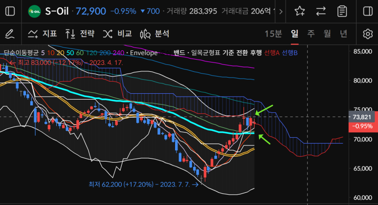 73000원의 저항을 보이고 있는 에스오일은 다음주 50일선 지지가 필요한 상황이다.