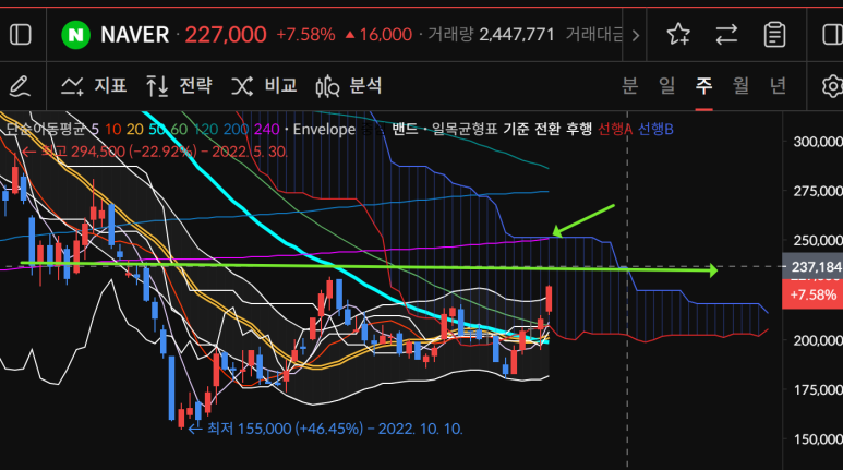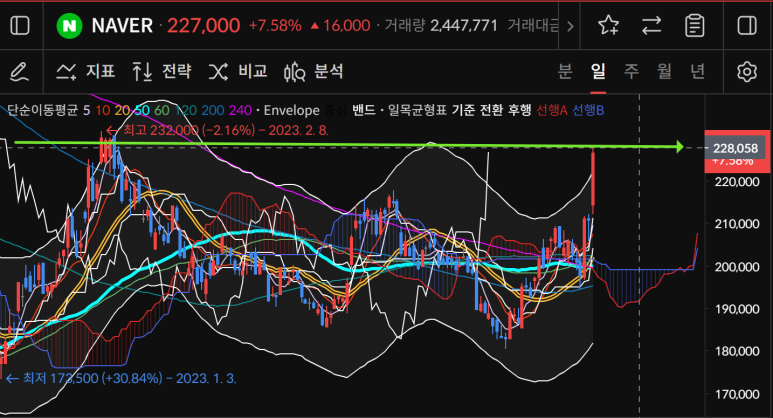 오늘 주식시장의 주인공인 네이버는 227000원까지 상승하면서 추가상승을 기대할 수 있게 되었다.