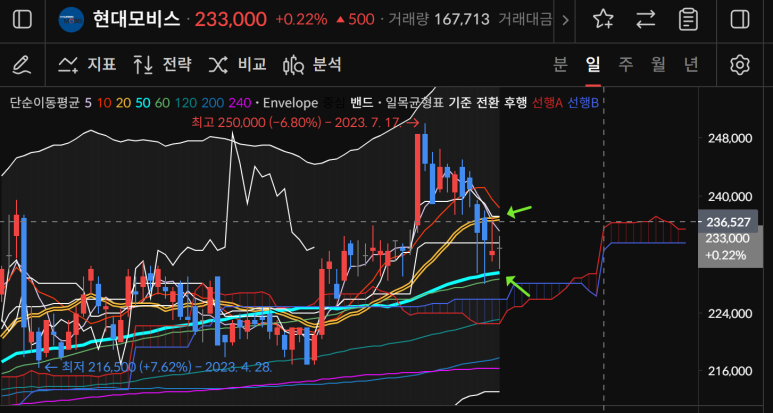 현대모비스는 25만원 이후 20일선이 깨진 상태로 50일선에서 지지를 보여왔기 때문에 아직까지는 20일선 회복을 기대할만하다.