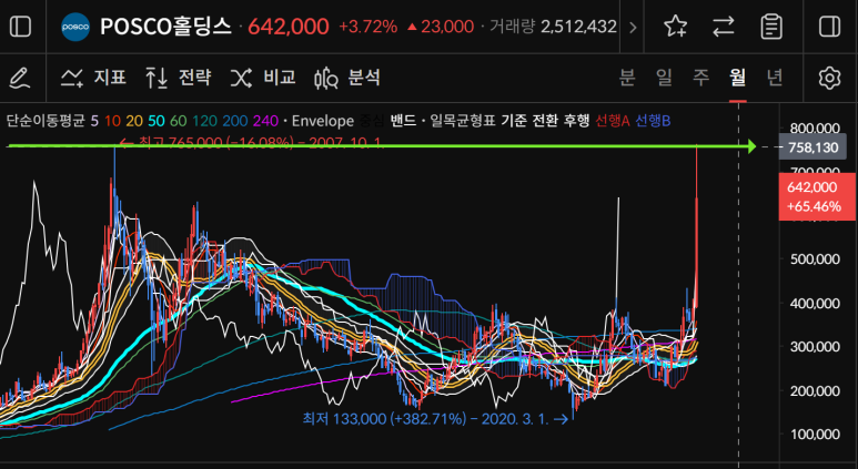 월차트로는 두 번의 큰 758000원부근의 저항을 보였다.