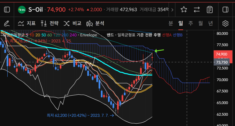 에스오일은 괜찮은 상황이다. 오늘 상승으로 120일선까지 왔기 떄문에 75000원의 저항을 보일 수 있겠지만 우선은 50일선을 넘어 양봉이 계속되고 있으므로 추가상승을 기대할 수 있겠다.