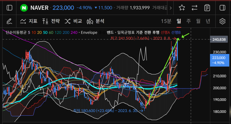 상승세를 보이던 네이버가 단 하루만에 241500원에서 큰하락이 나왔고 223000원이 되었다.