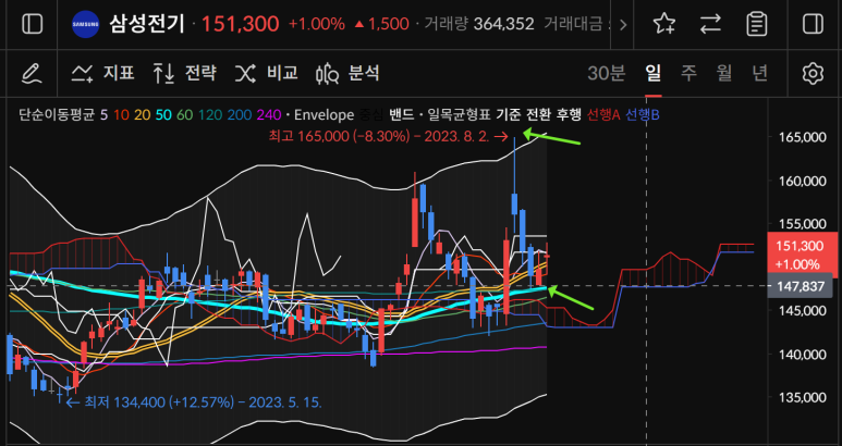 긴 윗꼬리 이후 50일선 부근에서 다시 20일선을 지킨 양봉이 나온 삼성전기는 이번의 상승세로 다시 155000원을 돌파하는 움직임이 나와야한다.