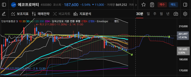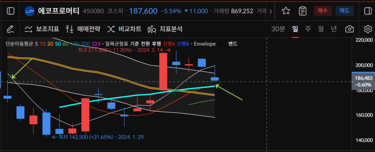 에코프로머티는 2월14일 이후 4일 연속 조정이 나왔다.