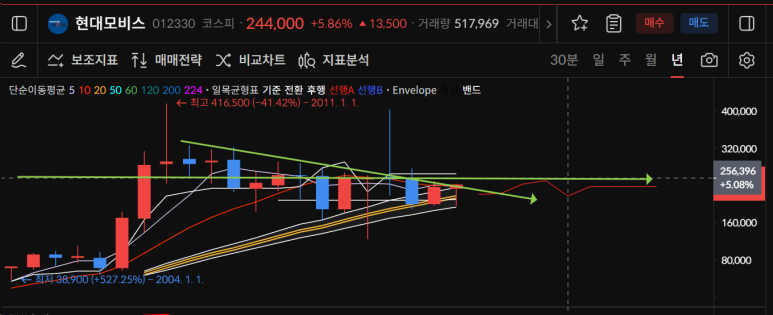 현대모비스는 2011년부터 미세하게 우하향하는 년차트를 보여주고 있는데