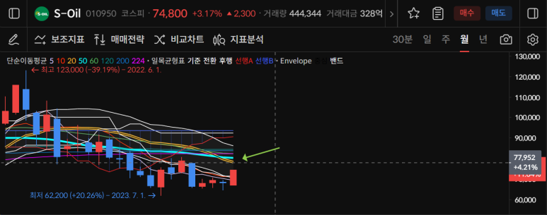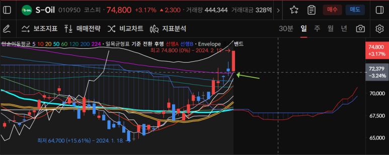 에스오일은 240일선을 돌파하는 긴 양봉이 나오며 74800원으로 마감되었다.