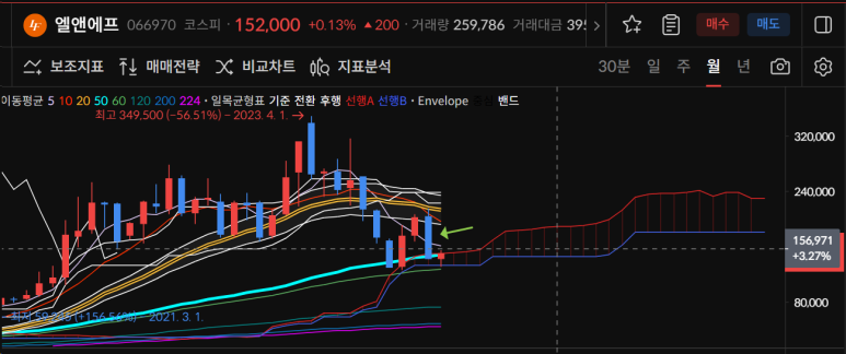 엘앤에프는 오늘 20일선을 터치하며 양봉으로 마감되었다.