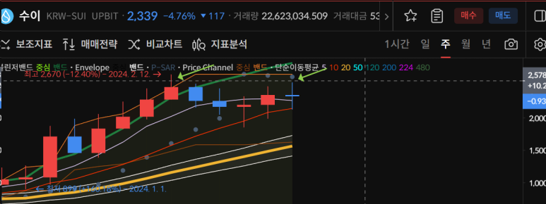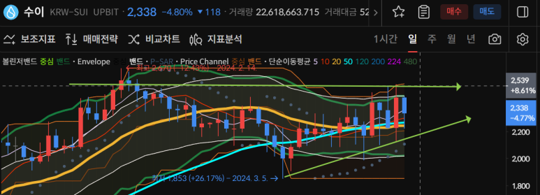 수이는 저항과 지지를 큰 변동성으로 보여주고 있는 차트로 20일선과 50일선 위를 유지하며 이어나가고 있다.
