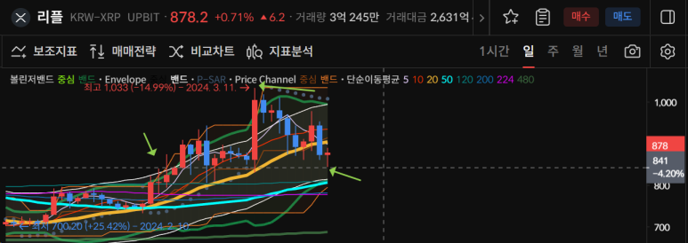 리플은 1033원 이후 조정으로 오늘은 878원대로 진행되고 있다.