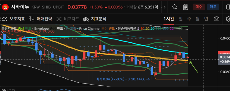 1시간봉차트에서 20일선을 기준으로 상승과 하락을 보여주고 있는 상황에서 비트코인의 방향에 따라 시바이누 역시 방향이 정해질 것으로 보이며 비트코인 상승 시 알트코인 특성상 큰 상승도 기대해볼 수 있겠다.