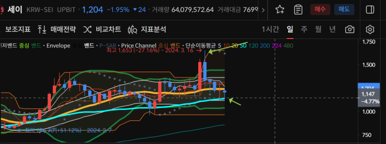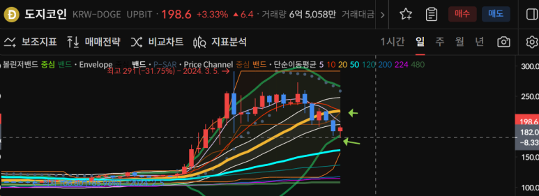 솔라나는 307500원 이후로 2개의 음봉이 되었고 오늘은 10일선을 지키는 형태로 진행되고 있다.