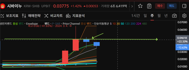 다만 시바이누는 주차트에서 2개의 음봉으로 진행되는 상황이고 저항자리가 있는 상황에서 당장 큰 상승보다는 회복을 하는데 더 많은 시간이 필요할 것 같다.