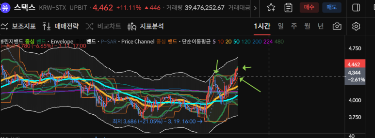 1시간봉으로 회복해야하는 다른 코인과는 달리 스택스는 이 전 고점을 돌파하며 확실한 상승을 보여주고 있기 때문이다.