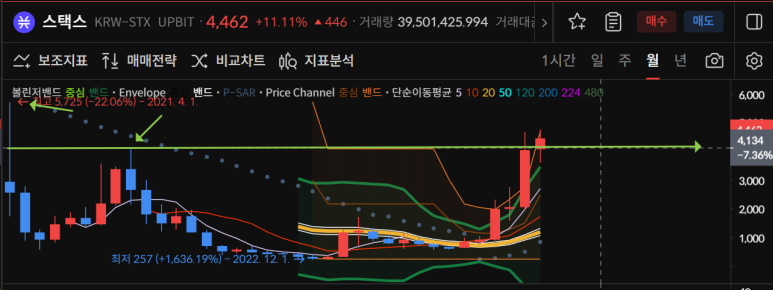 스택스는 이제 4134를 돌파하는 큰 상승이 나왔으므로 다음 목표는 5725가 되었다.