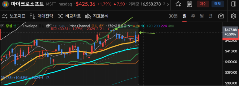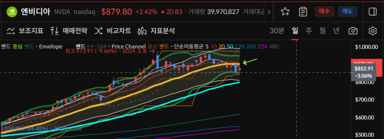 엔비디아는 20일선이 깨지는 음봉이 나왔고 아래지지선을 지지하며 다시 20일선회복을 목표로 하는 차트형태가 되었다.