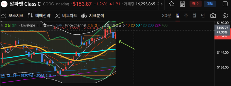 테슬라는 이 전 160대의 저점 이후 20일선 저항에서 또 한 번 160으로 저점을 갱신한 상황이다.