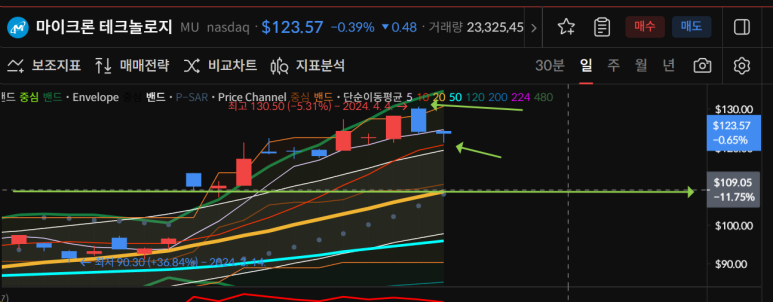 마이크론테크놀로지는 갭상승이후 130달러까지 올랐고 123으로 마무리되었다.