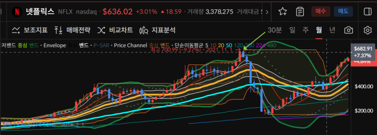 넷플릭스는 이 전 고점인 700이 아직 많이 남아있긴 하지만 700을 목표로 할 수 있는 형태의 차트가 진행되고 있다.
