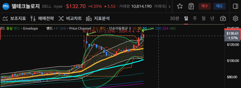 델테크놀로지가 이 전 고점을 넘어 136까지 올랐고, 다시 양봉으로 마무리되었다.