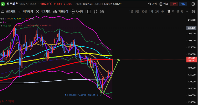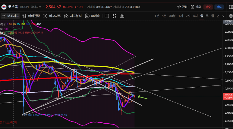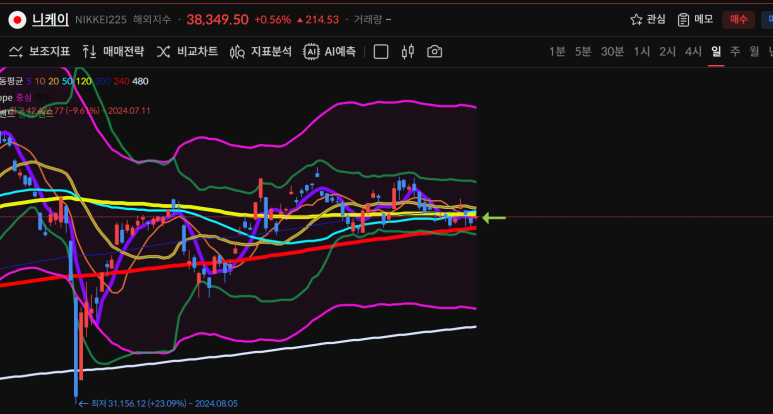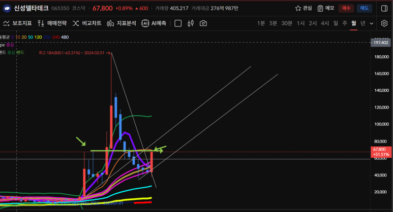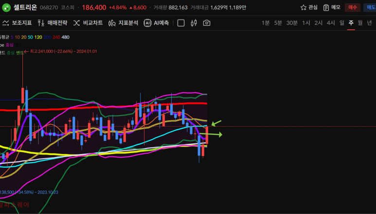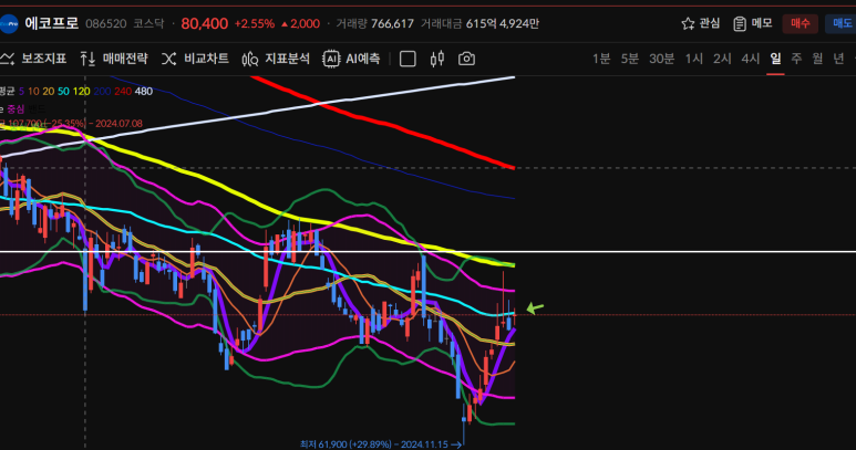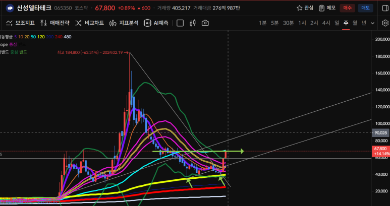 주차트로 이전 음봉을 모두 회복 했고 50일선으로 다음 음봉도 회복할 수 있는 모양이 되었기 때문에 내일 마감에 따라 20일선 회복까지 노릴 수 있게 되었다.