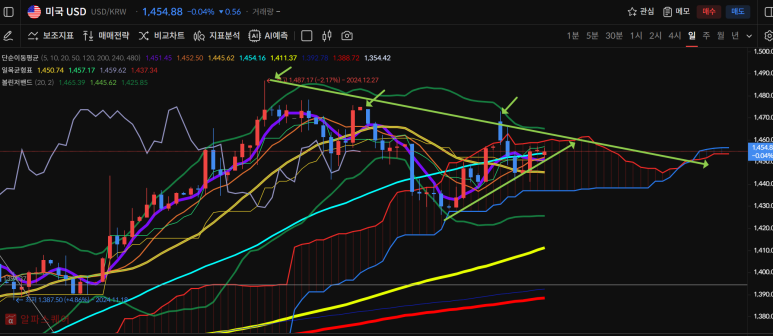 하락추세에는 있지만 볼린저밴드하단을 지지하면서 50일선을 이어나가고 있다는 점, 그리고 빨간구름떼 돌파가 가능하다는 점에서 이번주 달러 역시 상승의 가능성이 있다고 볼 수 있겠다.