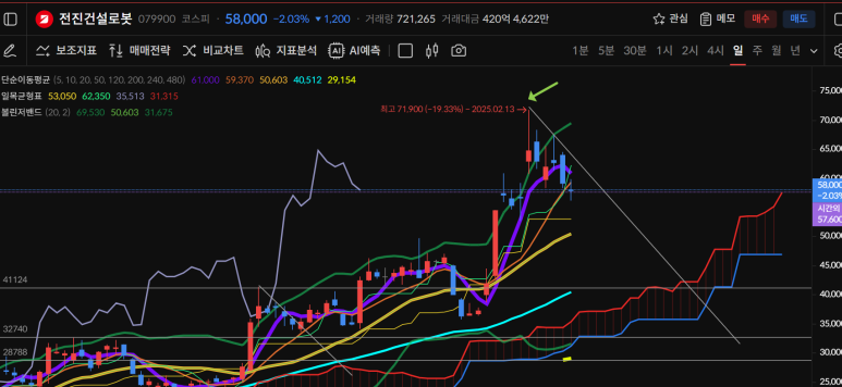 2월13일 고점 이후 하락세로 오늘은 5일선이 깨지는 음봉이 나왔다.