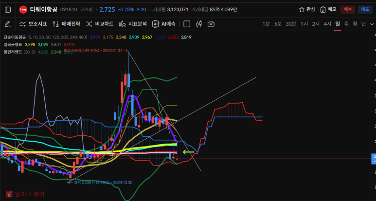 티웨이항공은 갭하락으로 480일선이 꺠진 후 추가하락이 나오고 있다.