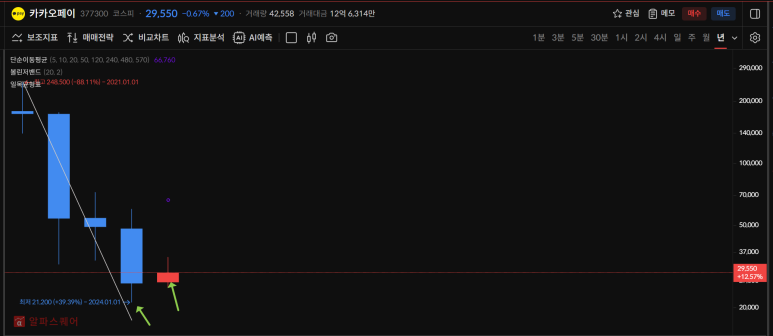 카카오페이는 상장이후 저점 21200원까지 기록했고